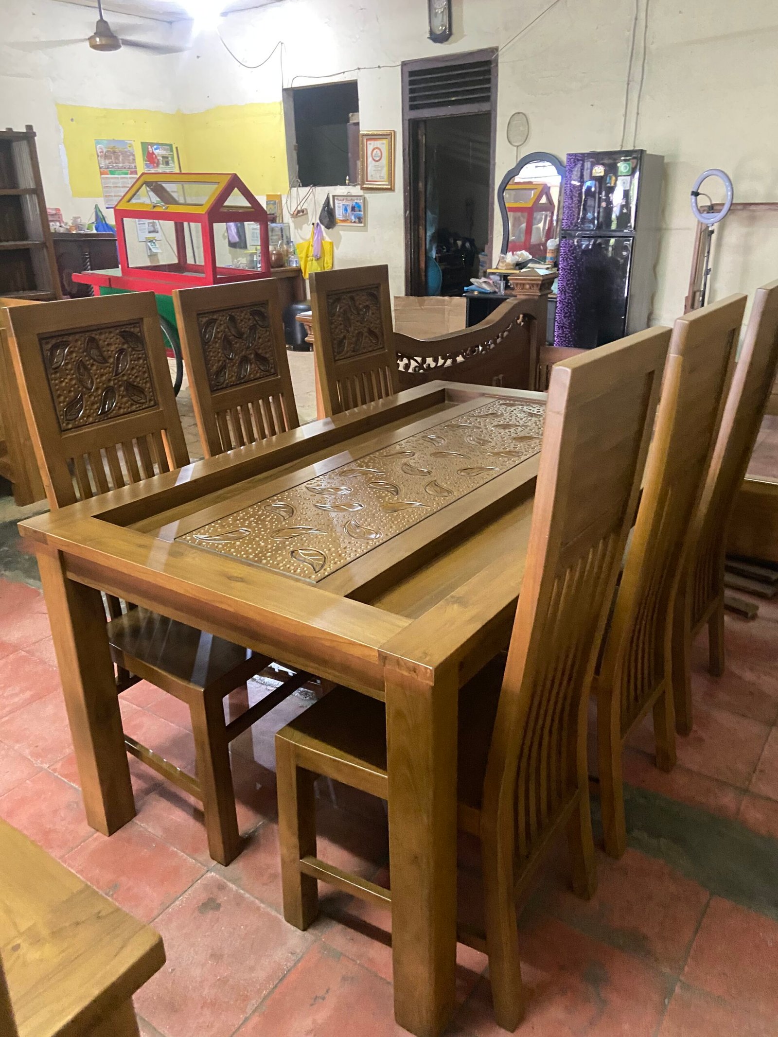 Hadirkan suasana makan yang elegan dan berkelas dengan Set Meja Makan Ukir Daun Jatuh. Set ini terdiri dari 1 meja makan dan 6 kursi, dengan detail ukiran motif Daun Jatuh yang memberikan kesan klasik dan artistik pada ruang makan Anda.